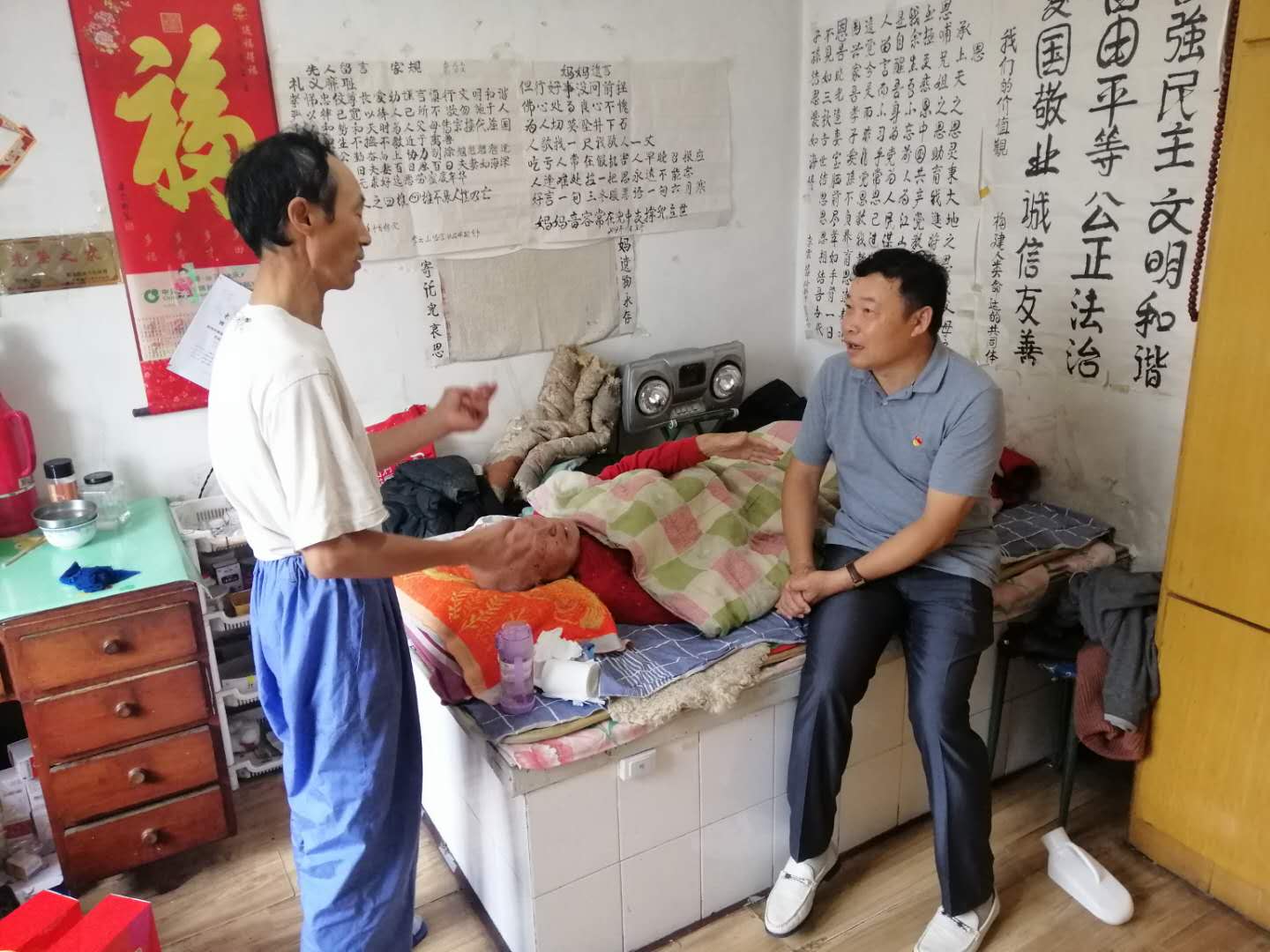 2020年8月13日,教学区工会主席李俊涛同志一行来到离休干部李云山同志家中,看望病中的李云山同志。李云山同志已经95岁高龄,前段时间,他因心脏和肠道疾病住院治疗。现在,他虽然出院了,但是身体依然很虚弱。李俊涛同志坐在李云山同志的床前,拉着他的手,关切地询问李云山同志的身体状况、询问李云山同志家庭生活情况,嘘寒问暖、关怀备至,李云山同志深受感动。