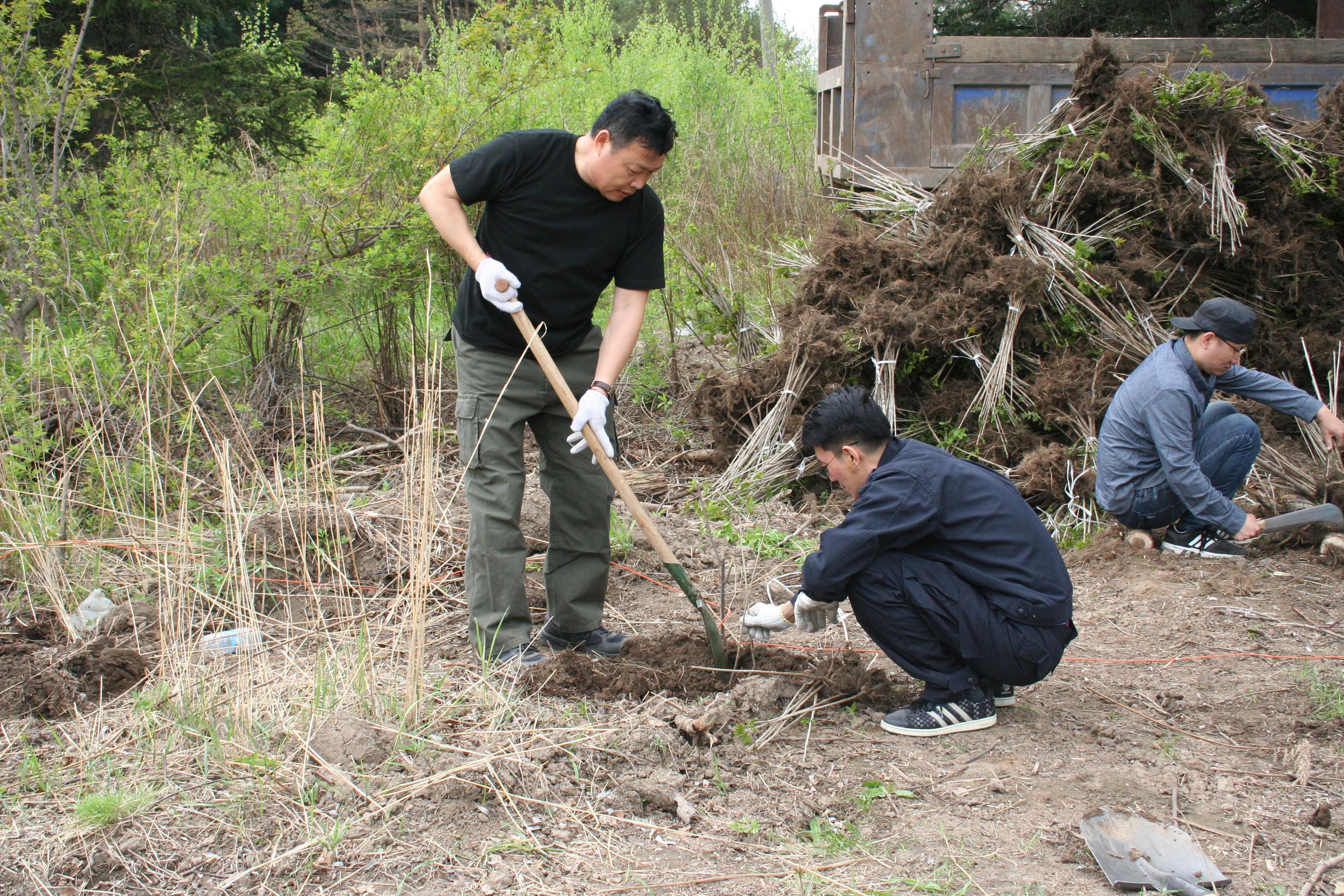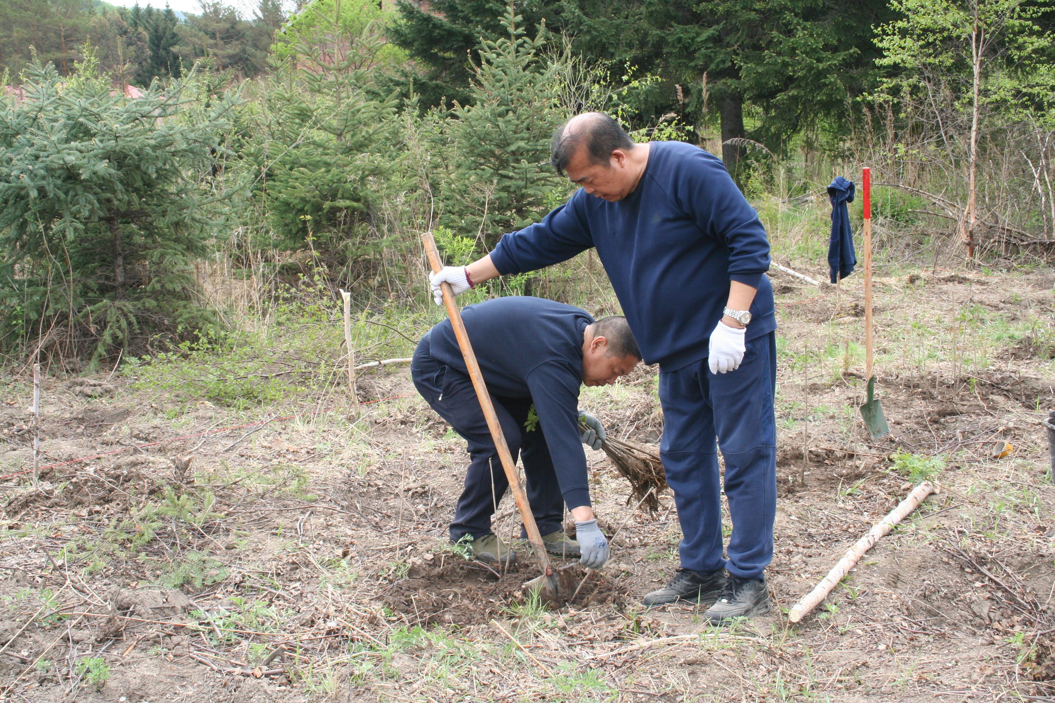 植树现场,场领导身先士卒、带头劳动,教学区职工挥锹铲土、挖坑培土、提水浇灌,认真细致地栽种好每一棵树苗。本次植树造林任务比较繁重,需要栽种水曲柳10000余株,然而教学区职工面对人员少、任务重的情况,齐心协力、干劲十足,虽然汗流浃背、腰酸背痛,但是大家一点都不松劲儿,植树现场一片热火朝天的景象。