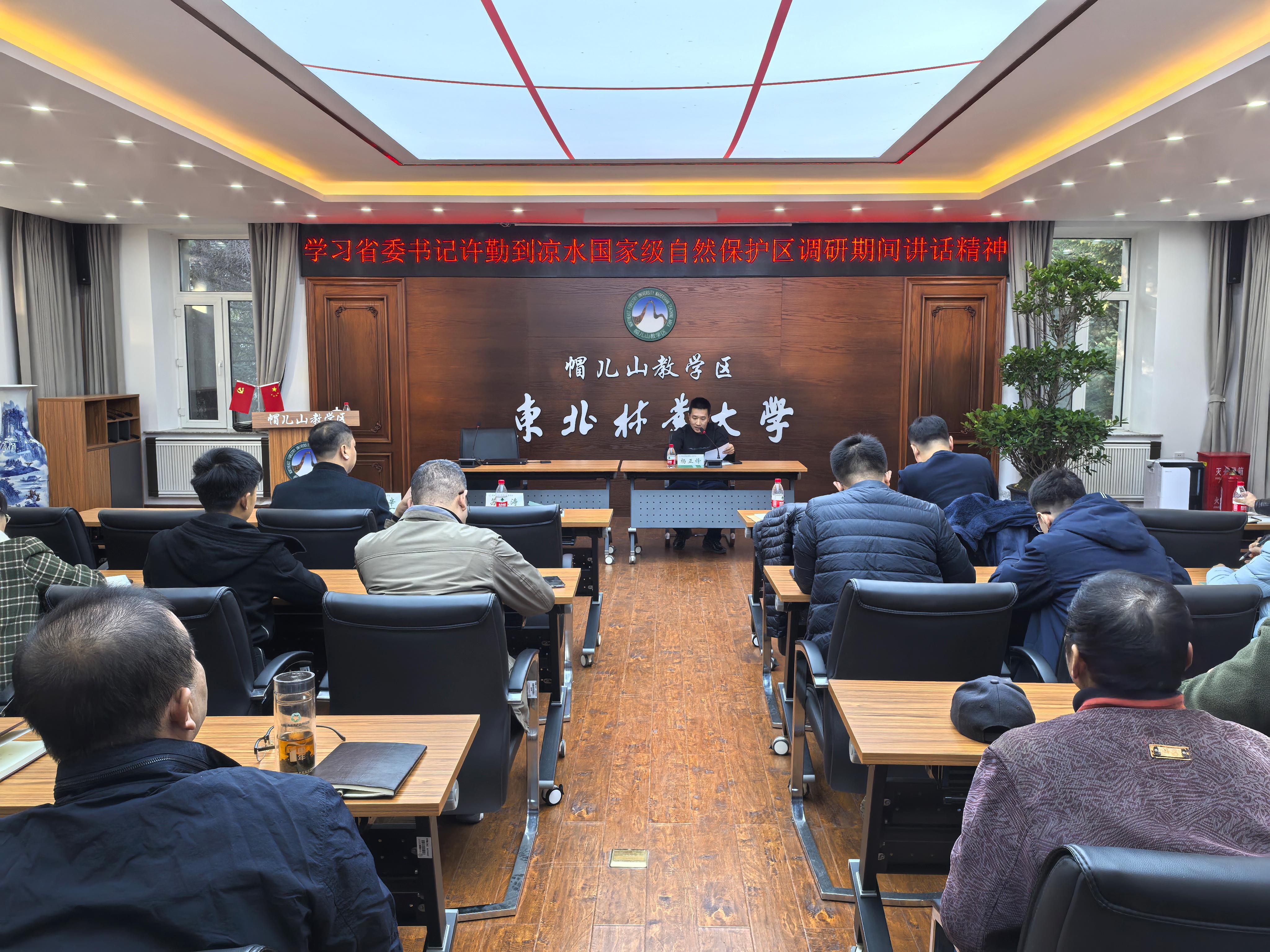 本次学习的内容为,省委书记、省人大常委会主任许勤到我校凉水国家级自然保护区调研期间的讲话精神,帽儿山教学区与凉水国家级自然保护区作为学校的两个教学、科研、实习基地,涉及相关的生态文明建设、资源保护、林业科研等工作。许勤在凉水保护区调研时强调,要认真践行习近平生态文明思想,树牢绿水青山就是金山银山理念,做好森林防灭火工作,这些要求对帽儿山教学区同样具有很强的指导意义。