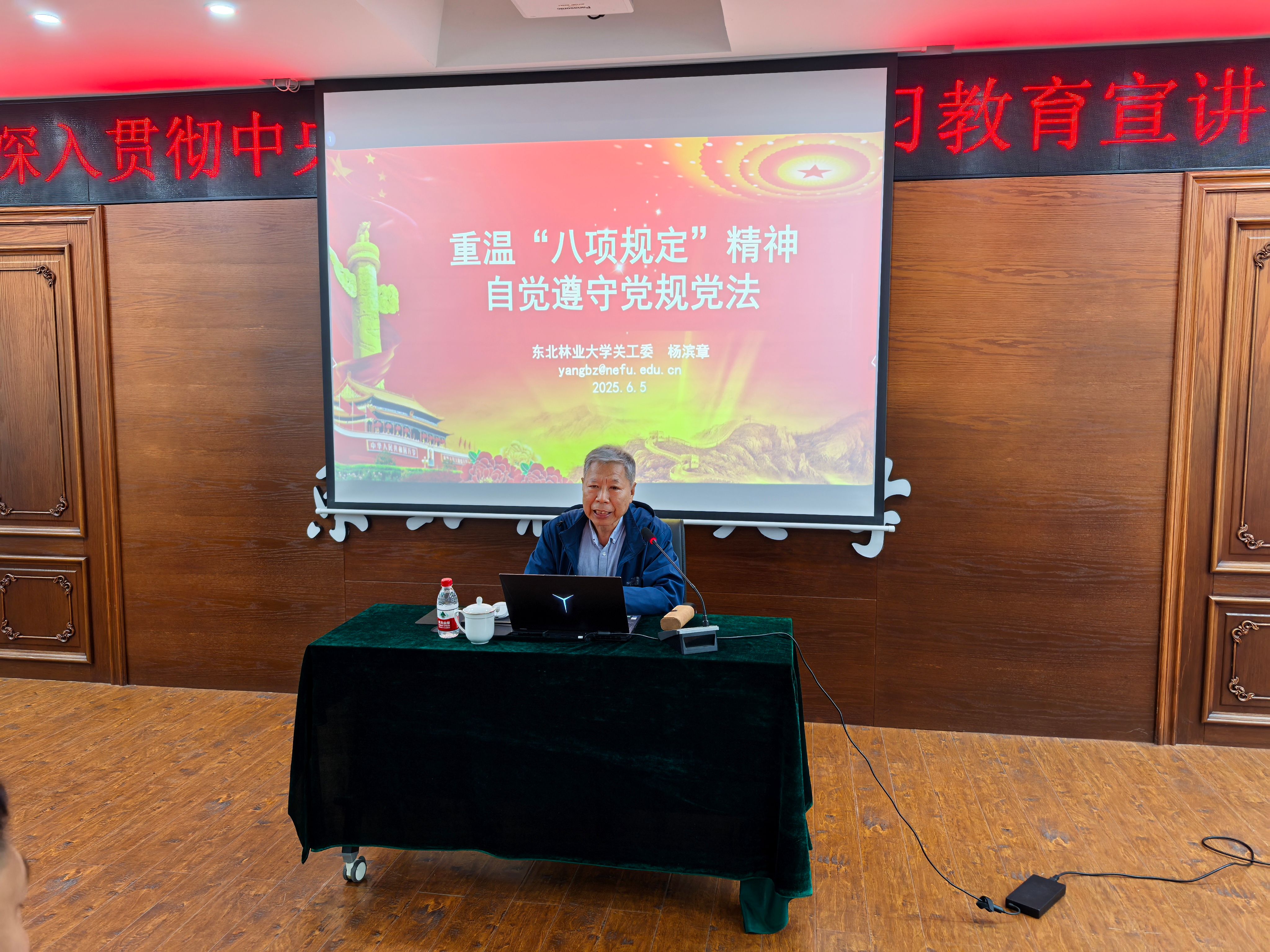 讲座特邀东北林业大学关工委杨滨章老师主讲,他以《重温“八项规定”精神 自觉遵守党规党法》为题,从“八项规定”出台的时代意义、基本内容、实践要求三个方面进行了深入解读。他指出,“八项规定”的出台是党中央全面从严治党的重要举措,是加强党风廉政建设、密切党群干群关系的关键抓手。结合帽儿山教学区实际,他强调,要深入贯彻中央八项规定精神,传承和弘扬林场建设初期形成的“人拉犁”精神,加强党组织和党员队伍建设,改进工作作风,坚定理想信念,强化纪律意识,提升党组织的战斗力,为推动林场高质效发展筑牢根基。