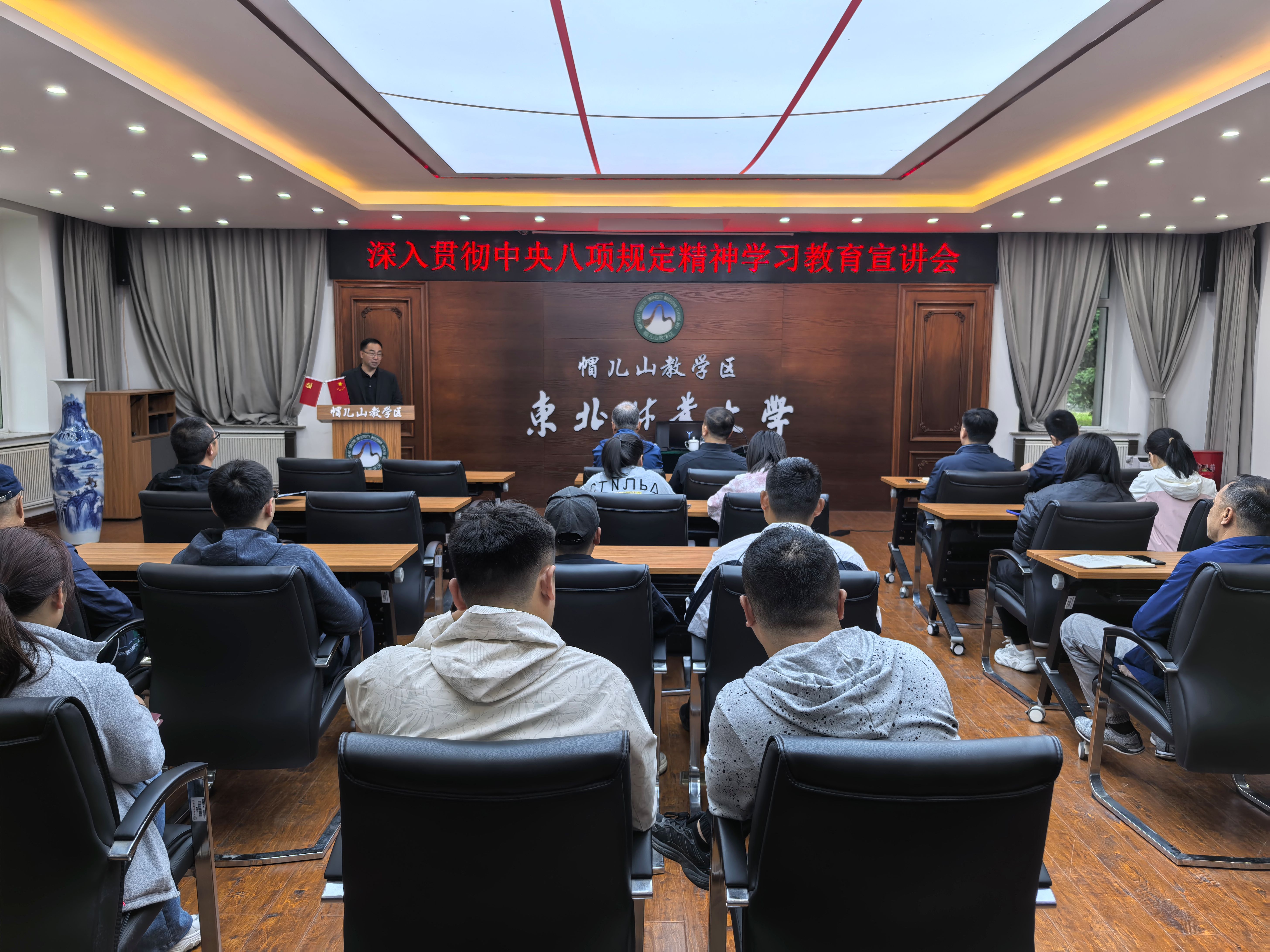 为深入贯彻落实习近平总书记关于加强党的作风建设的指示精神,持续深化中央八项规定精神学习教育,切实增强党员干部政治自觉和行动自觉,6月5日,帽儿山教学区在林政资源管理科会议室举办了深入贯彻中央八项规定精神学习教育专题讲座。讲座由林场党总支书记苏永涛主持,全体职工参加本次讲座。