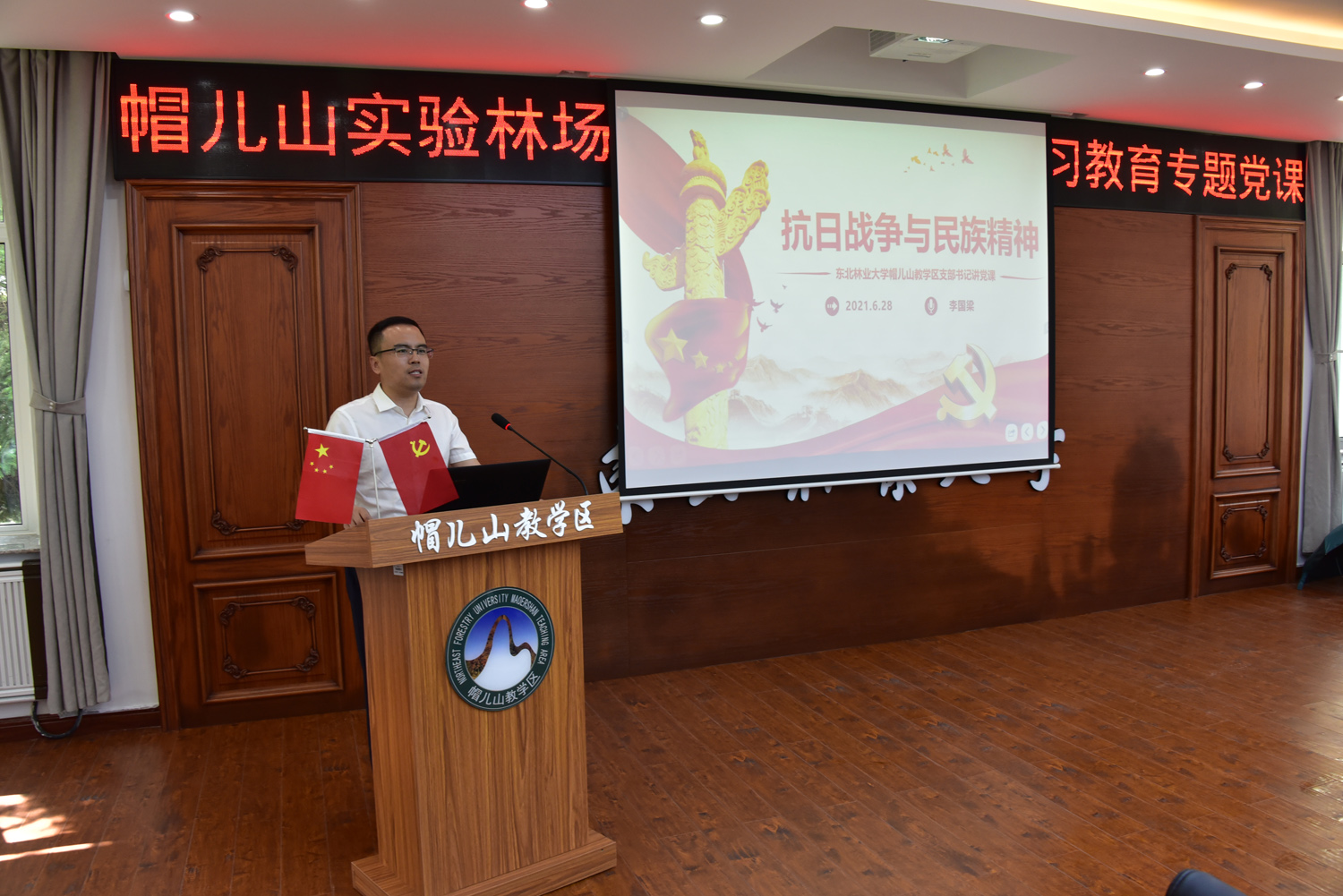 为深入开展党史学习教育,按照学校党史学习教育工作方案安排,6月28日下午,林场党总支书记李国梁在林场第二会议室讲授了题为《抗日战争与民族精神》的专题党课。帽儿山实验林场全体党员参加了学习。